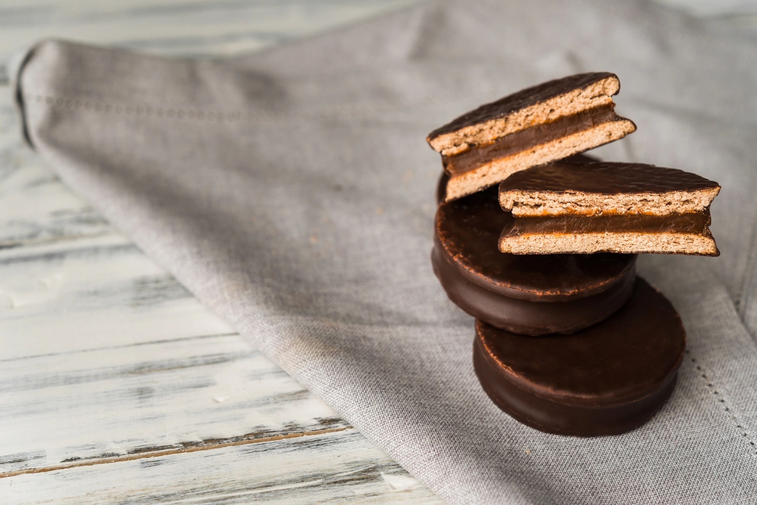 Exquisita galleta de cacao tipo sandwich relleno de cremoso dulce de leche y cubertura de chocolate semiamargo.